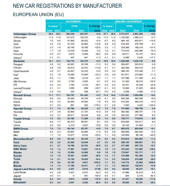 V novembri 2025 Tesla v EÚ zaregistrovala približne 12-tisíc vozidiel, čo znamená medziročný pokles o viac než tretinu. Jej trhový podiel klesol na úroveň okolo 1,4 %, a to v čase, keď celkový európsky trh s novými autami mierne rastie. Ešte výraznejšie je porovnanie s čínskymi značkami. BYD v rovnakom období zaznamenal viac než dvojnásobný rast predajov a v niektorých krajinách sa už dostáva na úroveň Tesly alebo ju priamo predbieha. Rast evidujú aj ďalšie čínske značky, najmä MG patriace pod skupinu SAIC.