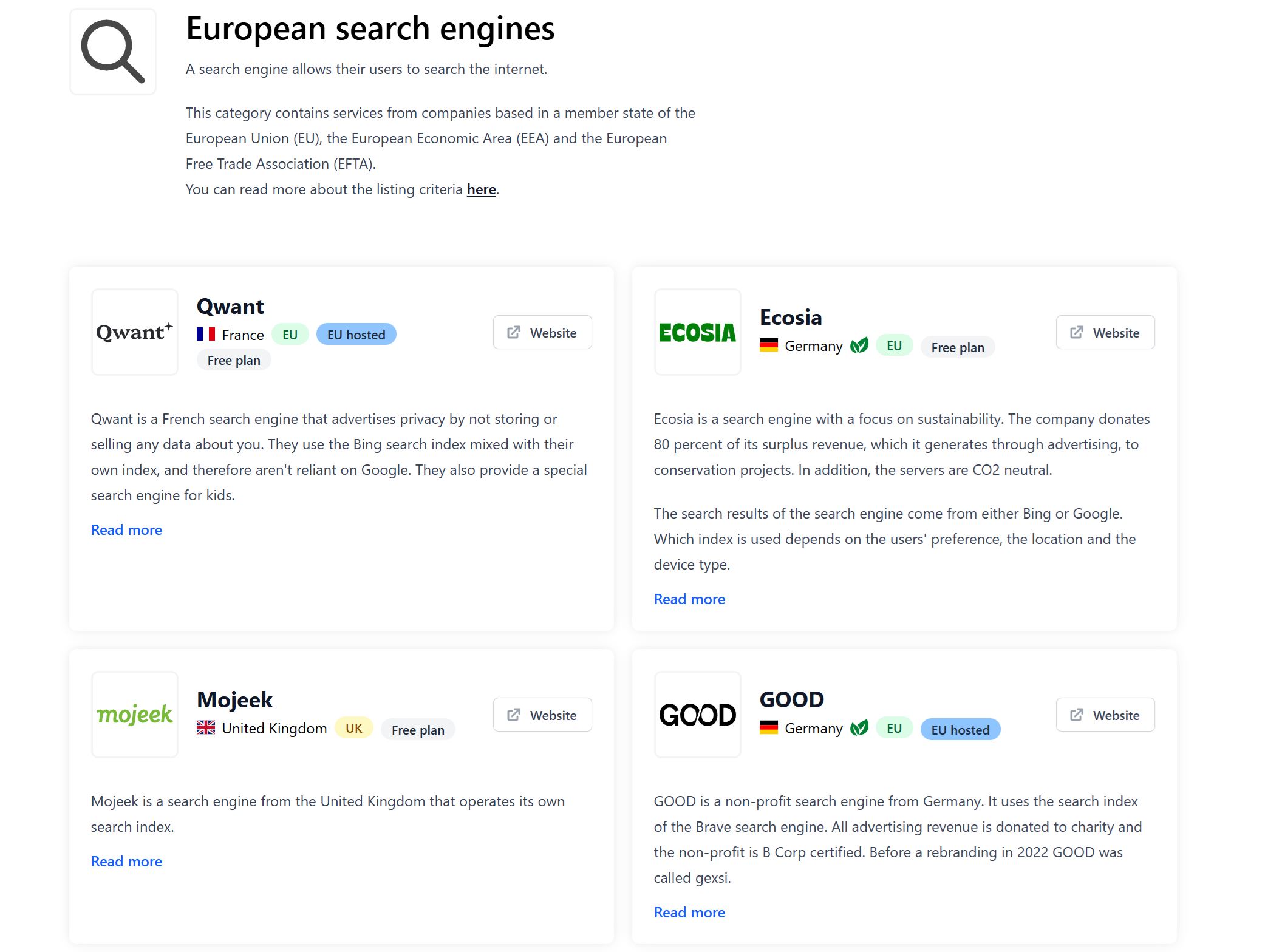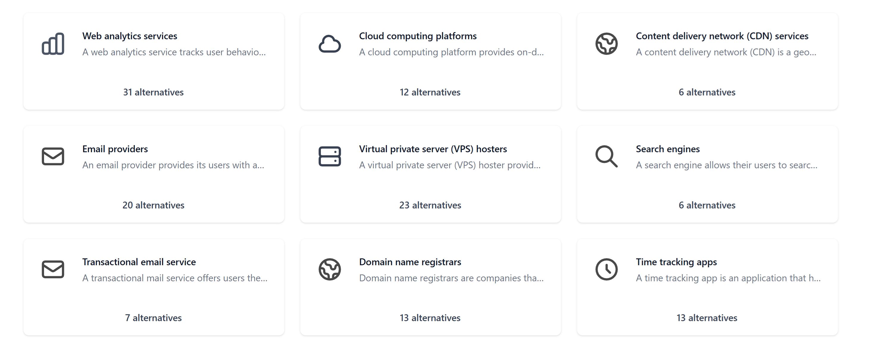 Na domovskej stránke sú kategórie ako webová analytika, cloud platformy, CDN, e-mail, VPS hosting, registrátori domén, monitorovanie dostupnosti, úložiská súborov či prekladače. Viete tak nájsť náhrady za americké vyhľadávače, sociálne služby a prakticky všetko.