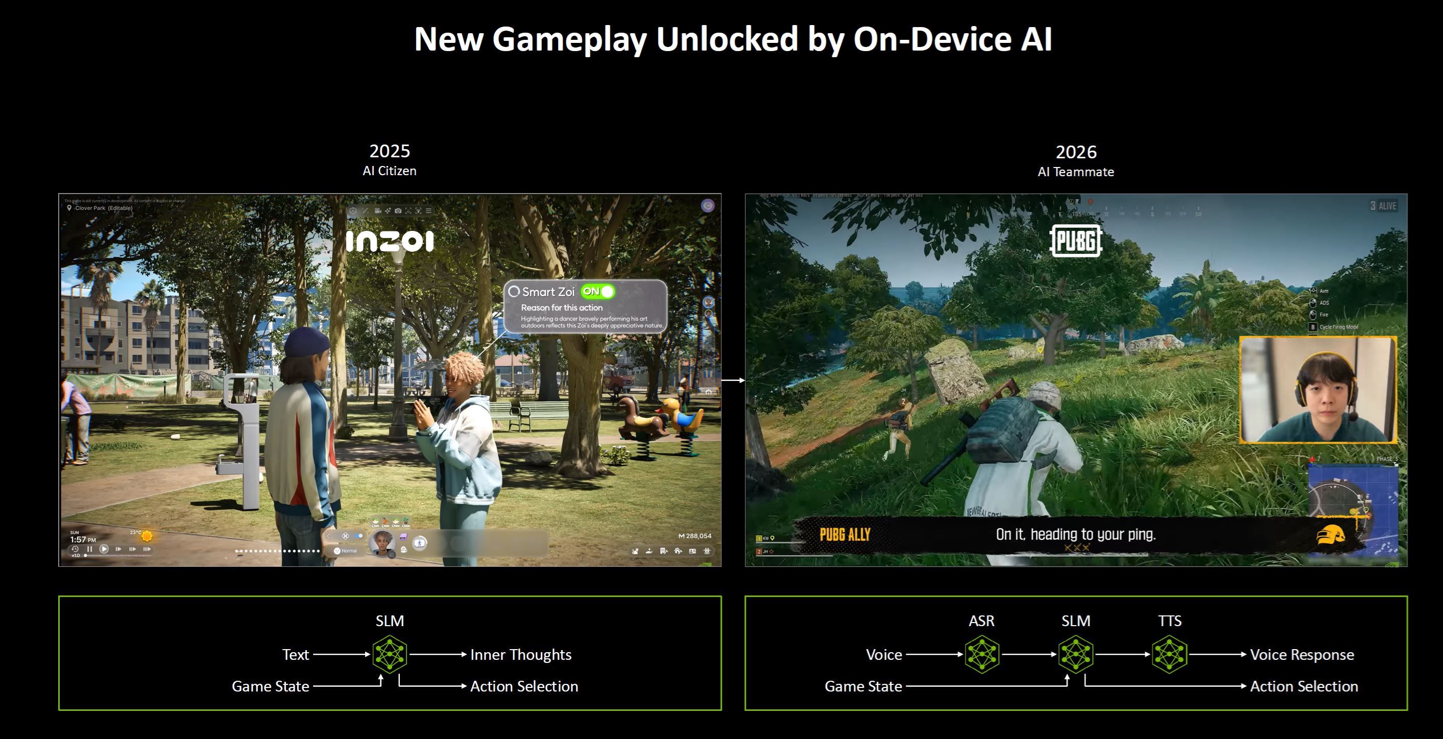 Príkladom je AI poradca pre Total War: PHARAOH, postavený na NVIDIA ACE, ktorý analyzuje tisíce herných dátových tabuliek a v reálnom čase radí hráčovi s ekonomikou, diplomaciou či vojenskými rozhodnutiami. Playtest programu je plánovaný na rok 2026.