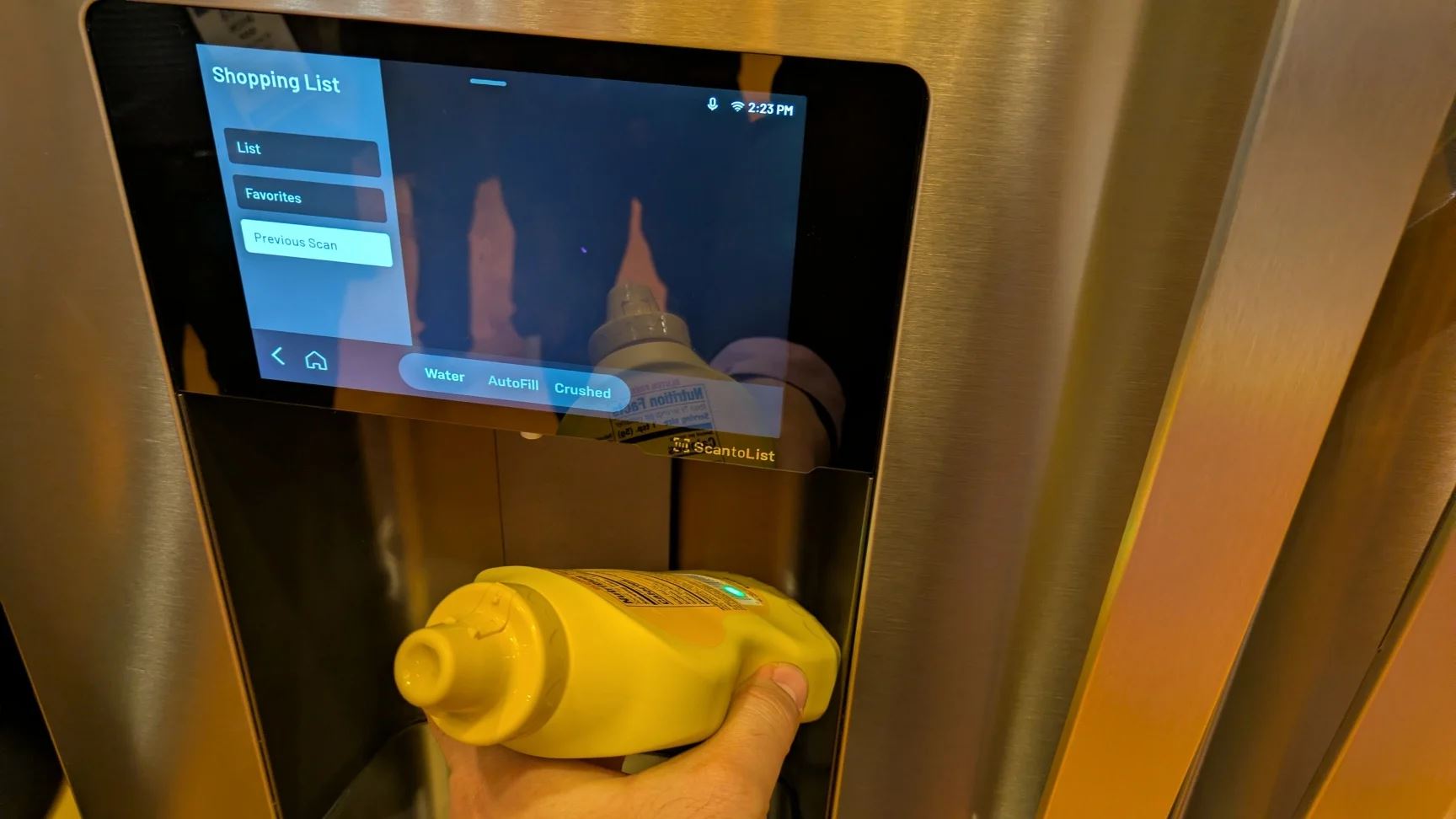 Základom je vstavaný skener čiarových kódov umiestnený priamo v module dávkovača vody a ľadu. Keď sa niektorá potravina míňa, používateľ naskenuje jej obal a chladnička ju automaticky pridá do digitálneho nákupného zoznamu v aplikácii SmartHQ. Systém rozpoznáva viac ako štyri milióny produktov a k položkám ukladá aj detaily ako značka, príchuť či veľkosť balenia. Zoznam je možné zdieľať s členmi domácnosti alebo ho priamo synchronizovať so službou Instacart (v US) pre doručenie nákupu.