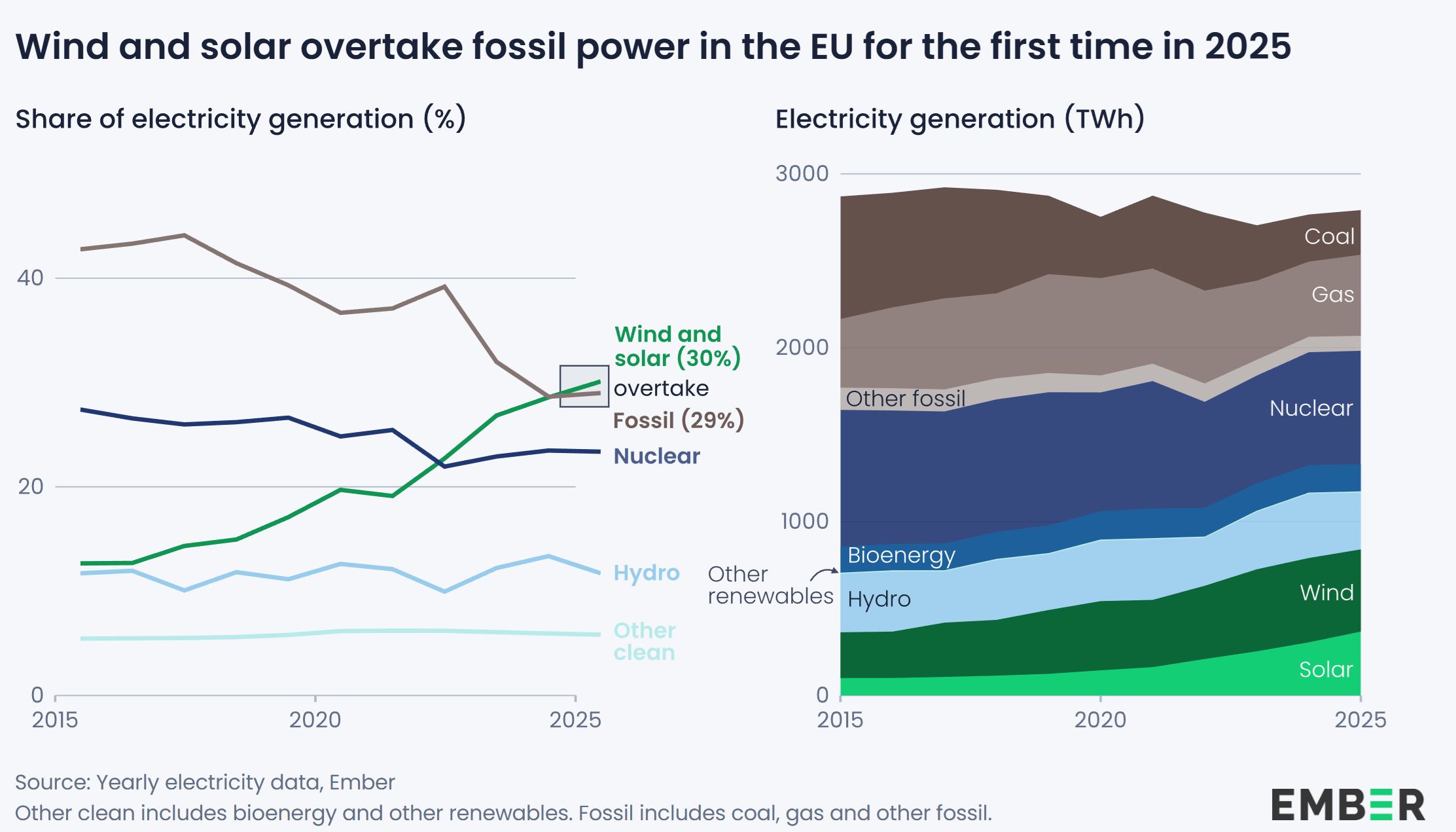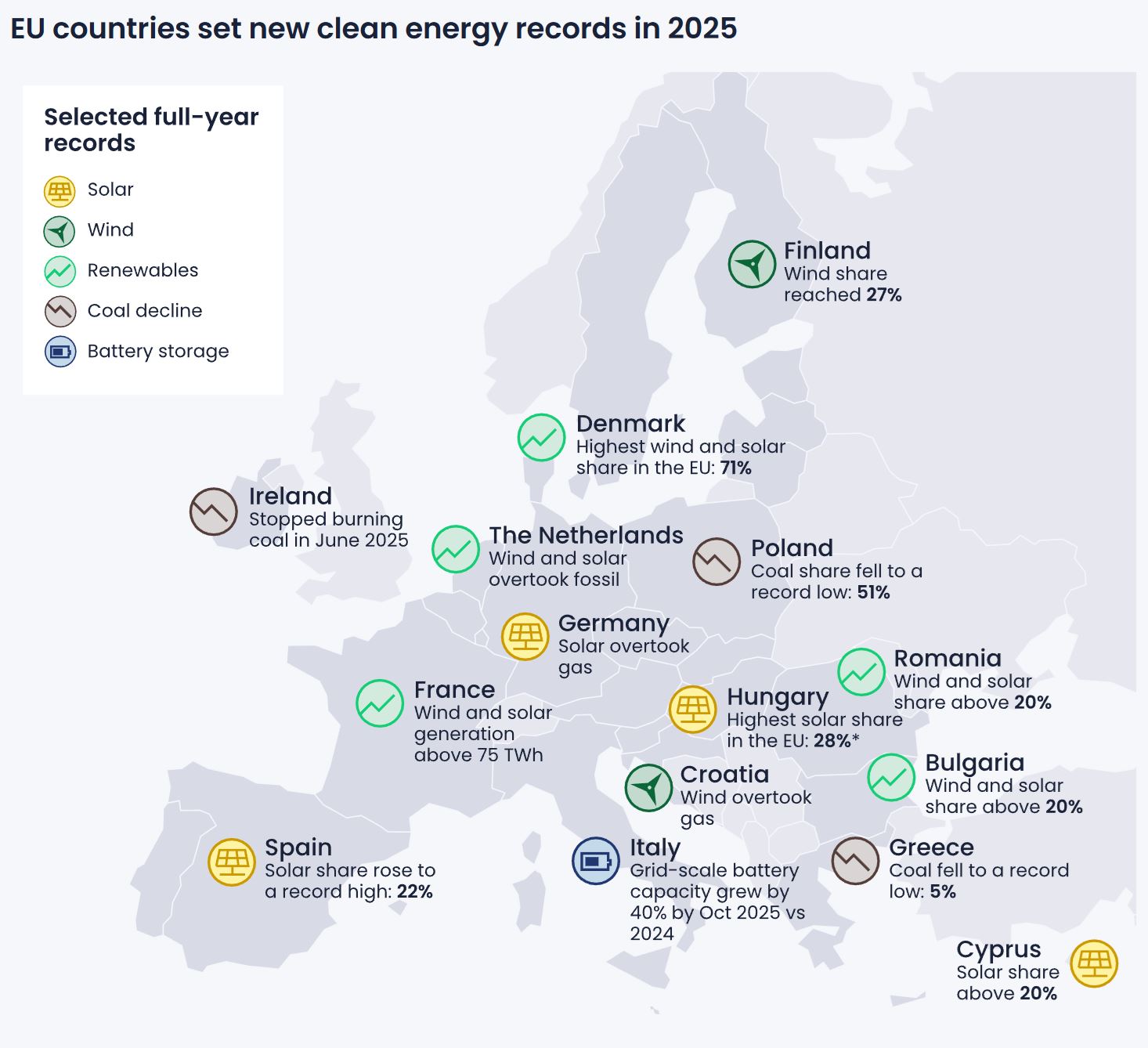 Solárna energia dosiahla v EÚ v roku 2025 výrobu 369 TWh, čo predstavuje medziročný nárast o viac než 20 %. Solárne zdroje sa tak dostali na úroveň 13 % celkovej výroby elektriny v Únii a v niektorých krajinách, ako Maďarsko, Grécko, Španielsko či Holandsko, pokrývali viac než pätinu spotreby. Vietor si udržal stabilnú pozíciu s podielom 17 % a zostal druhým najväčším zdrojom elektriny v EÚ.
