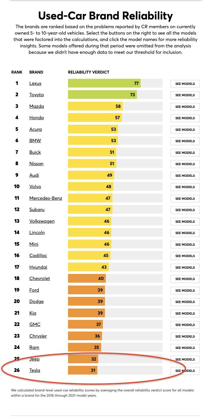 Problémy Tesly sa neobmedzujú len na softvér. Consumer Reports zaradil Teslu na posledné miesto v dlhodobej spoľahlivosti áut vo veku 5 až 10 rokov spomedzi 26 značiek. Na opačnom konci rebríčka sú Lexus a Toyota.