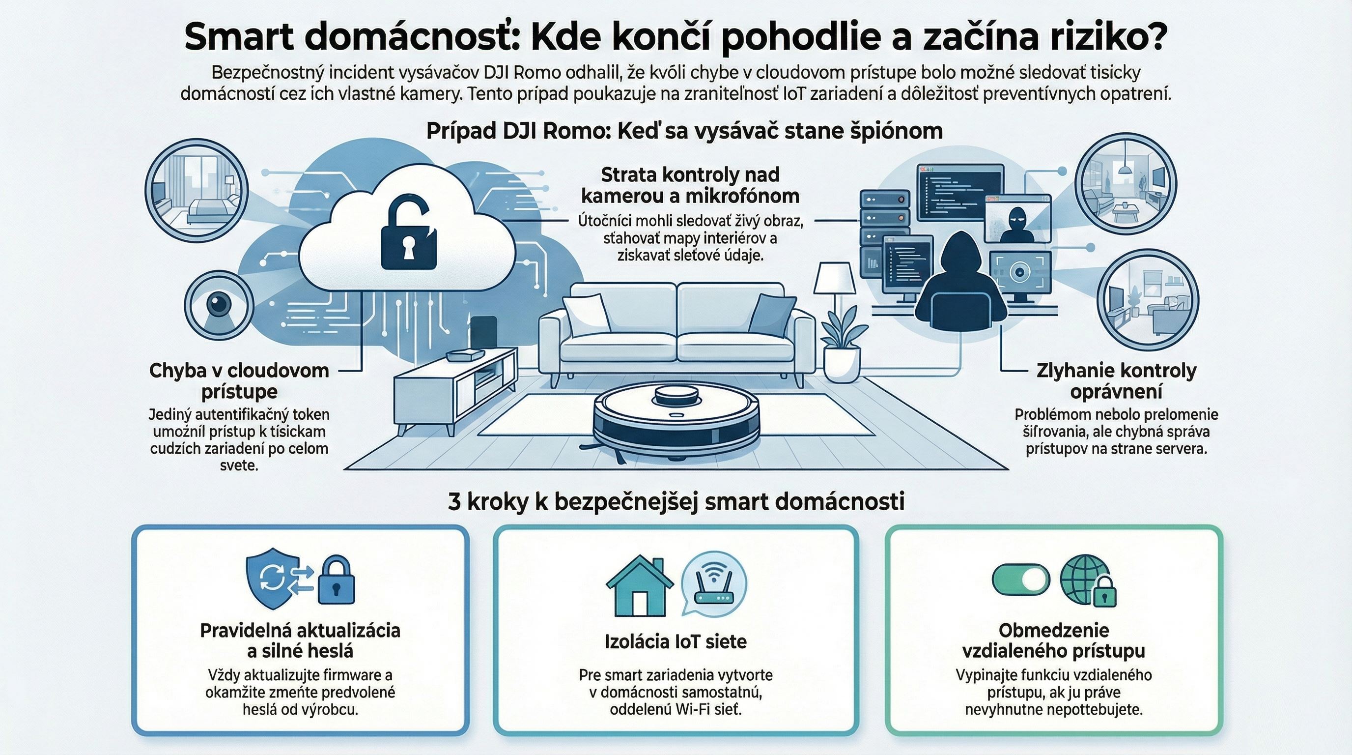 Prípad DJI Romo neznamená, že všetky podobné zariadenia sú nebezpečné. Ukazuje však, že komfort smart domácnosti ide ruka v ruke s rizikom. A pri zariadeniach s kamerou by mala byť opatrnosť samozrejmosťou.