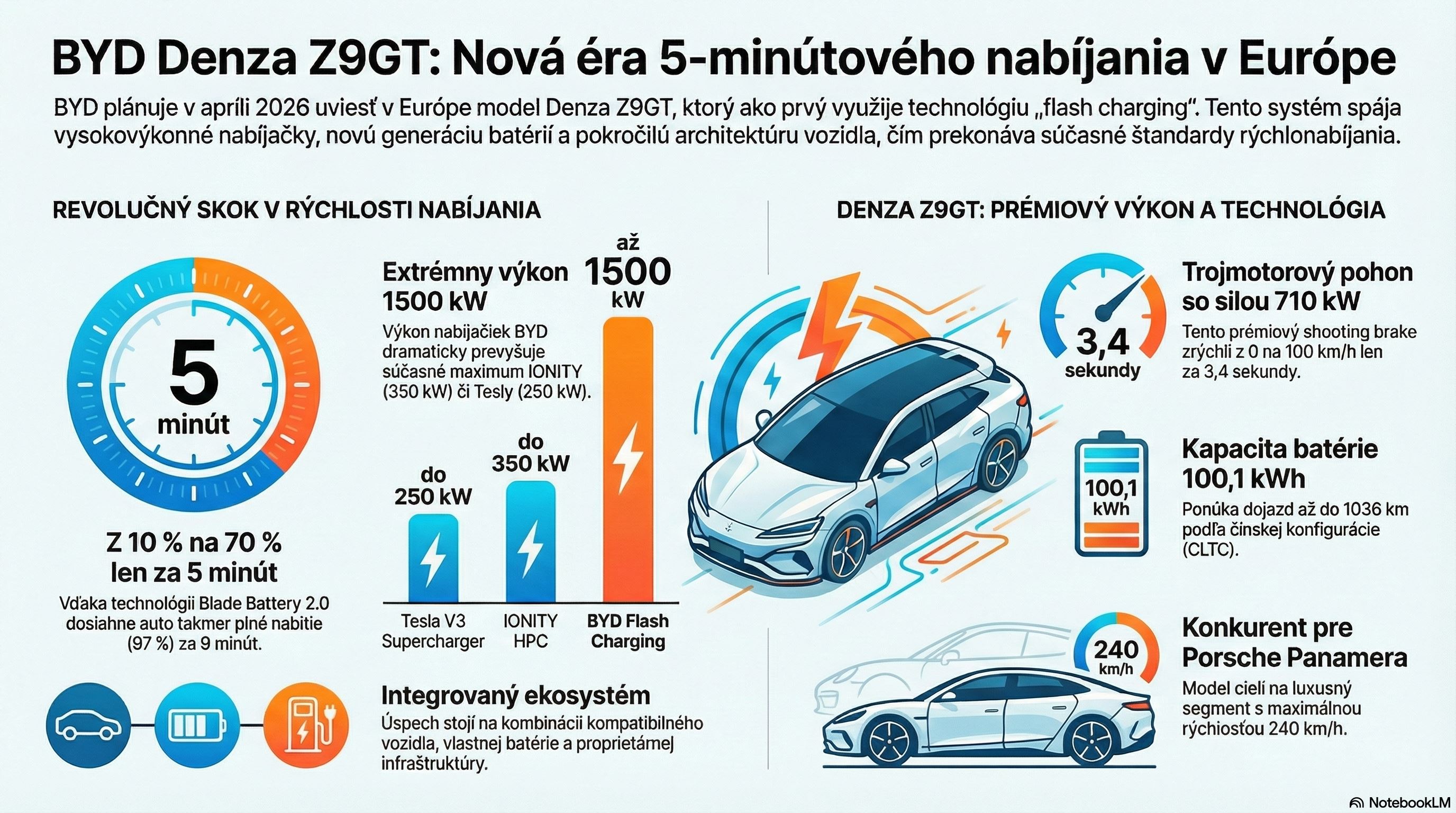 BYD chce v Európe zaujať nielen novým autom, ale aj samotným spôsobom nabíjania. Podľa Reuters prinesie v apríli do Európy prémiový model Denza Z9GT, ktorý má ukázať firemnú technológiu flash charging. Práve tá má podľa BYD umožniť dobitie z 10 na 70 % za päť minút, pričom európska premiéra auta je naplánovaná na 8. apríla v Paríži (už sme si o nabíjaní na smartpode písali a autá sa nabíjajú do 10 minút)