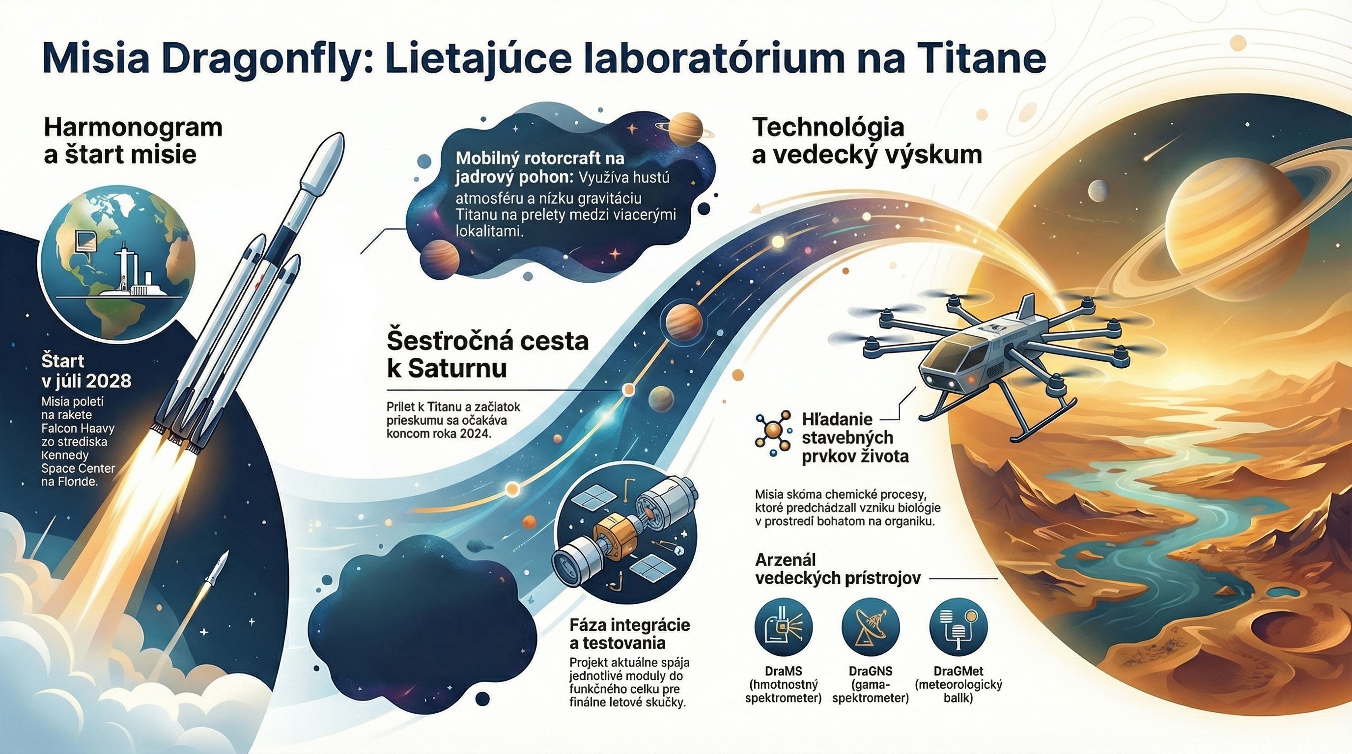 Titan je jediný mesiac v Slnečnej sústave s hustou atmosférou. Práve tá robí z Dragonfly niečo viac než len exotický experiment. Hustý vzduch a nižšia gravitácia totiž výrazne uľahčujú let, takže vrtuľník sa bude môcť presúvať medzi rôznymi miestami a skúmať ich priamo na povrchu. NASA zdôrazňuje, že misia nemá hľadať život priamo, ale skúmať chemické procesy, ktoré mohli pripomínať podmienky na veľmi mladej Zemi ešte pred vznikom biológie.