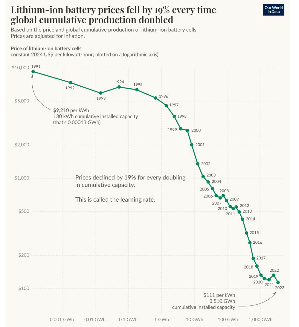 Najväčší zlom neprišiel vďaka jednému objavu. Our World in Data upozorňuje, že batérie zlacňovali vďaka takzvanej learning curve, teda postupnému učeniu výroby. S rastúcou produkciou sa zlepšovala chémia, výrobné procesy, automatizácia aj dodávateľské reťazce. Od roku 1998 pritom platí, že pri každom zdvojnásobení kumulatívnej globálnej výroby batérií ich cena klesla približne o 19 %.